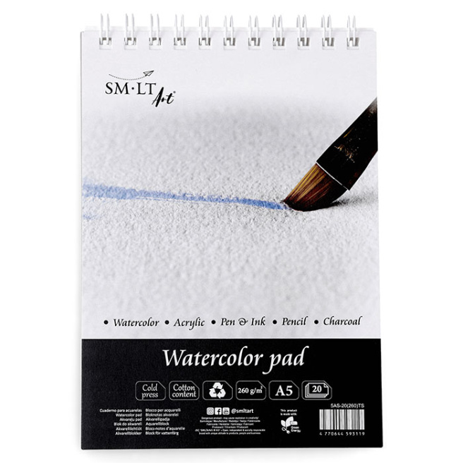 Hârtia pentru albumul de acuarelă Smiltainis special clasic alb cu spirală este cea mai bună alegere pentru artist. - Fără acid. - Format: A4. - Densitate: 260g/m2. - Cu adaos de bumbac. - Granulație medie.