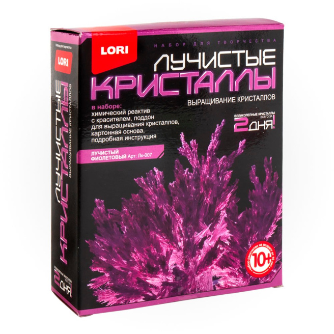• O experiență chimică care este simplă și de înțeles chiar și pentru un copil să crească rapid un frumos cristal pufos. Cristalul crește doar 1-2 zile. Formatul de ambalaj mic vă permite să așezați economic mărfurile pe raft. O opțiune excelentă de cadouri! Opțiuni: Reactiv chimic pentru colorant, tavă pentru creșterea cristalului, bază de carton, instrucțiuni de dronare