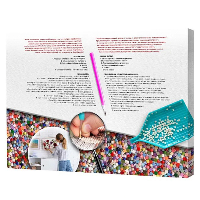 Principalul avantaj este relaxarea completă în timpul procesului. Deasemenea culorile strălucitoare îşi vor păstra saturația pe o perioadă îndelungată. Setul include: pânza cu o schemă de culori imprimată pe ea și o bază adezivă, un set de pietre acrilice multicolore, pensetă, un creion cu un tampon din silicon și o placă mică pentru lucrul cu pietre.