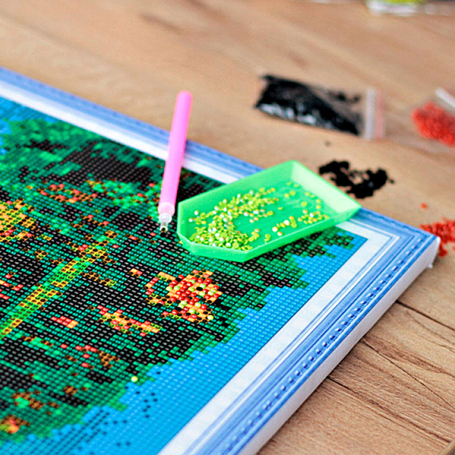 Principalul avantaj este relaxarea completă în timpul procesului. Deasemenea culorile strălucitoare îşi vor păstra saturația pe o perioadă îndelungată. Setul include: pânza cu o schemă de culori imprimată pe ea și o bază adezivă, un set de pietre acrilice multicolore, pensetă, un creion cu un tampon din silicon și o placă mică pentru lucrul cu pietre.