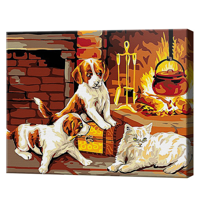 Micuții pufoși la șemineu 20x30 cm, pictură pe numere