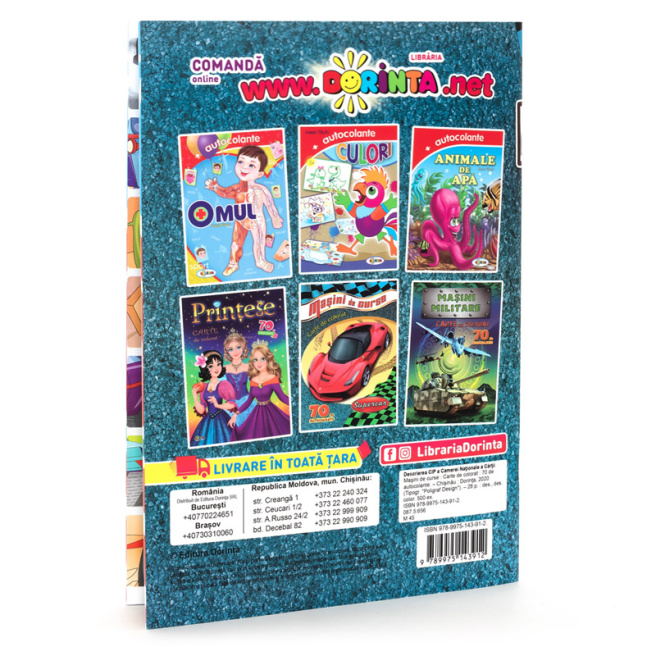 • Această carte ilustrată, cu autocolante îi va ajuta pe cei mici să asocieze cuvintele cu imaginile corespunzatoare și să lipească autocolantele potrivite ca să învețe mijloacele de transport. În așa fel, copiii se vor distra, iși vor dezvolta motricitatea fină, își vor exersa capacitatea de concentrare și își vor antrena imaginația. Cartea conține ilustrații viu colorate.