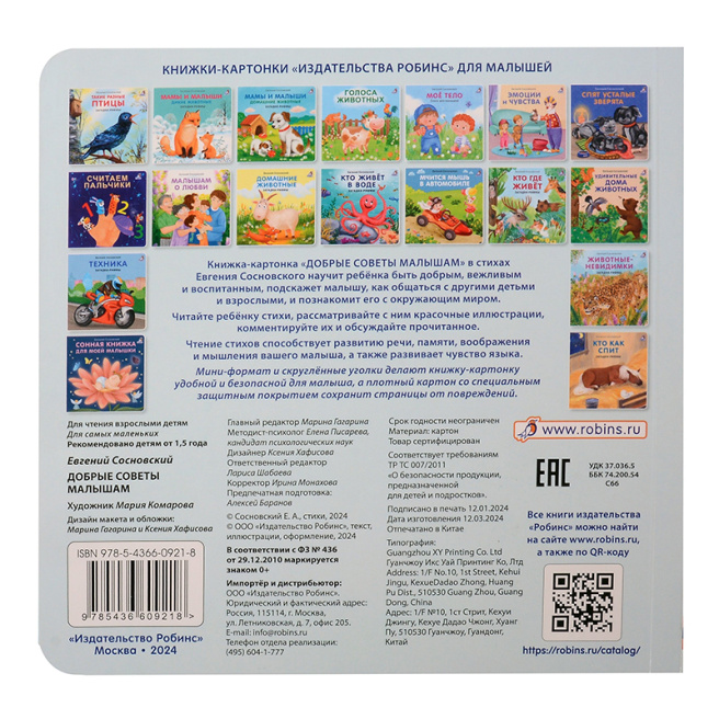 Книжка-картонка «Добрые советы малышам» Евгения Сосновского научит ребёнка быть добрым, вежливым и воспитанным, подскажет малышу, как общаться с другими детьми и взрослыми, и познакомит его с окружающим миром.Читайте ребёнку стихи, рассматривайте с ним красочные иллюстрации, комментируйте их и обсуждайте прочитанное.Чтение стихов способствует развитию речи, памяти, воображения и мышления вашего малыша, а также развивает чувство языка.