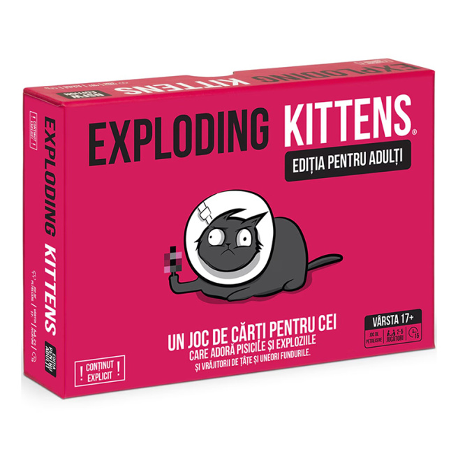 Conținut: 56 de cărți, instrucțiuni. Exploding Kittens este un joc de cărți premiat care a făcut istorie pe Kickstarter când a devenit proiectul cu cei mai mulți susținători.