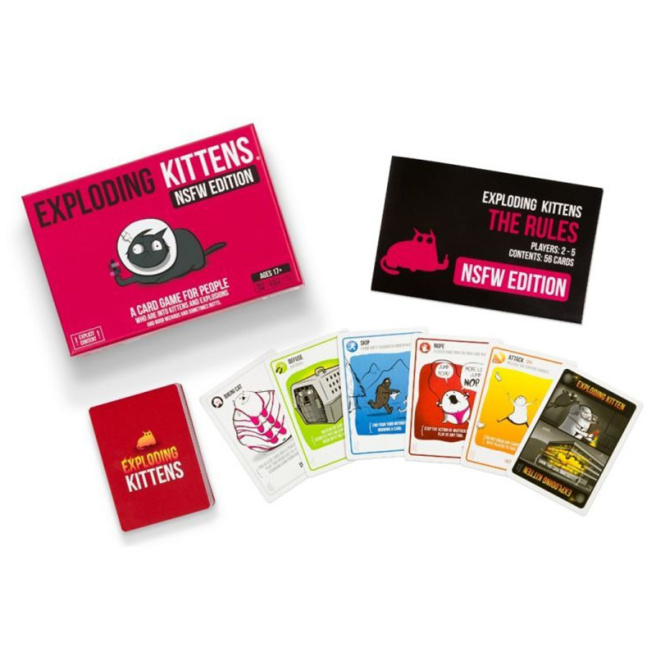 • Exploding Kittens for Adults este un joc de petrecere pentru jucători cu vârsta de peste 17 ani. Jucătorii trag cărți până când cineva împușcă o pisicuță explozivă, moment în care aceasta devine moartă și este eliminată din joc. Toate celelalte cărți sunt folosite pentru a muta, înmuia sau evita pisicile explozive. Această versiune pentru adulți a jocului conține versiunea completă a jocului Exploding Kittens, dar ilustrațiile de pe fiecare carte au fost modificate pentru a fi prea explicite pentru a fi utilizate într-un joc standard Exploding Kittens.