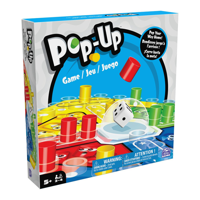 Este format dintr-o tablă colorată cu pioni amuzanți cu fețe, împărțiți în patru zone. în patru zone. În mijloc, sub cupola transparentă a sistemului Pop Up. este un zar. Acest lucru înseamnă că nu arunci zarul, ci mai degrabă. apăsați pe cupolă, ceea ce face ca zarurile închise de sub ea să sară.