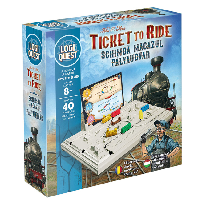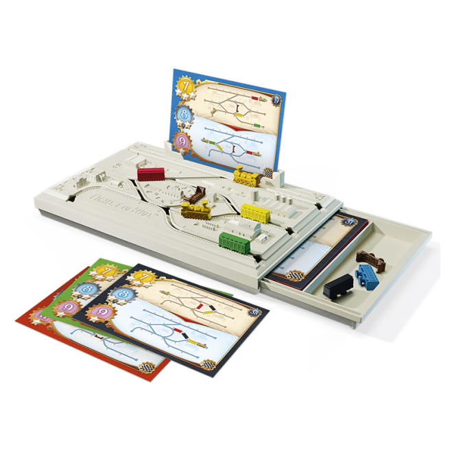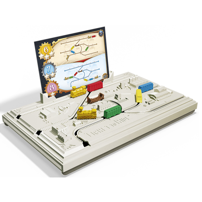 • Acest joc de logică și inteligență conține 40 de provocări pe 4 niveluri de dificultate. Potrivit atât pentru copiii de peste 8 ani cât și pentru adulți, jocul conține: 1 planșeta feroviară, 40 de cartonașe cu provocări, 1 cartonaș pentru depou, 2 locomotive, 5 vagoane (1 Albastru, 1 Roșu, 1 Verde, 1 Galben, 1 Negru), 2 cai ferate dezafectate, instrucțiuni.