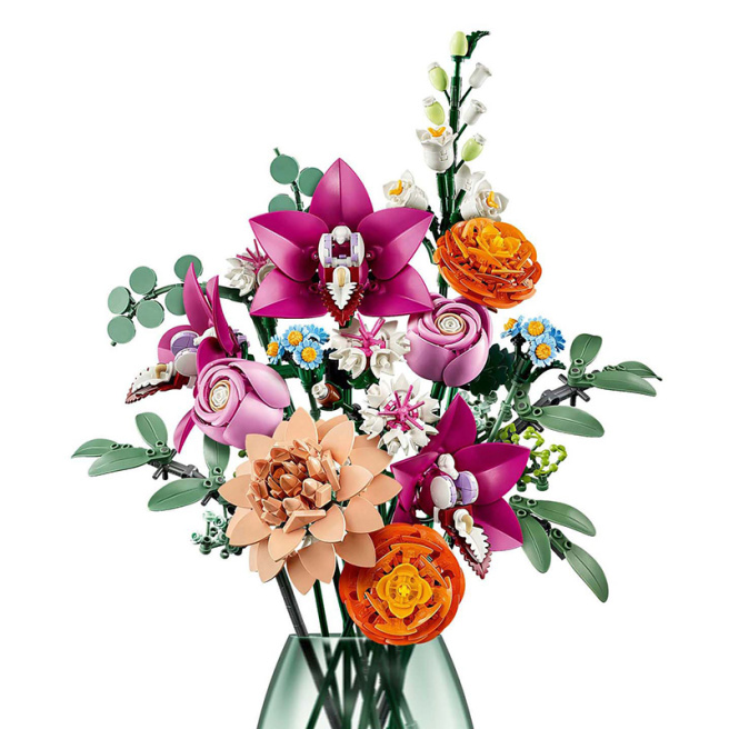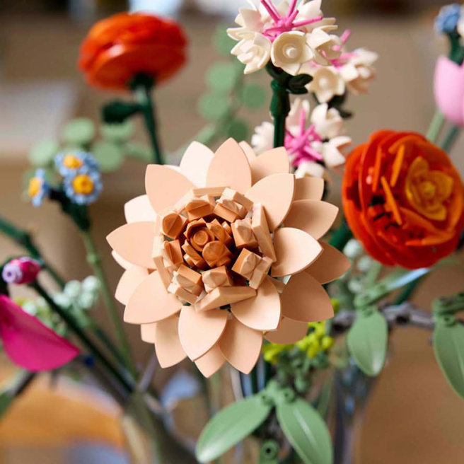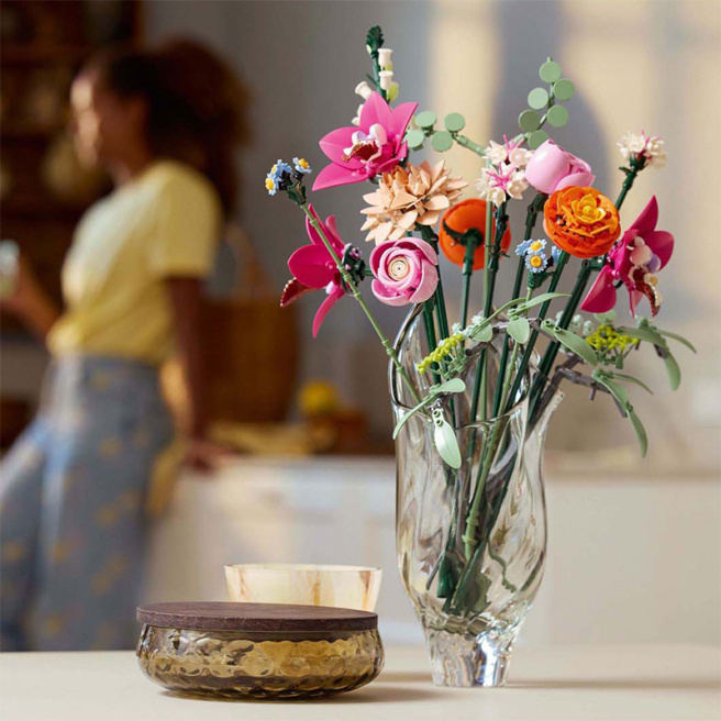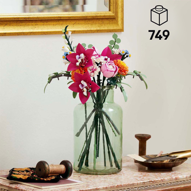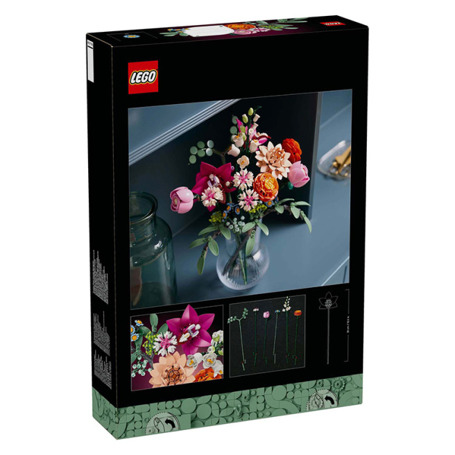 Florarii în devenire se pot relaxa și relaxa în timp ce asamblează un buchet din 15 tulpini de flori LEGO, inclusiv margarete, flori de porumb, eucalipt, flori de soc, trandafiri, ranunculus, orhidee cymbidium, dalii și campanule. Toate tulpinile sunt reglabile, permițându-vă să asamblați un buchet personalizat care poate fi folosit ca decor floral pentru casa sau biroul dumneavoastră. Pentru o personalizare suplimentară, florile pot fi combinate cu alte buchete LEGO vândute separat pentru a crea un aranjament floral mare și unic.