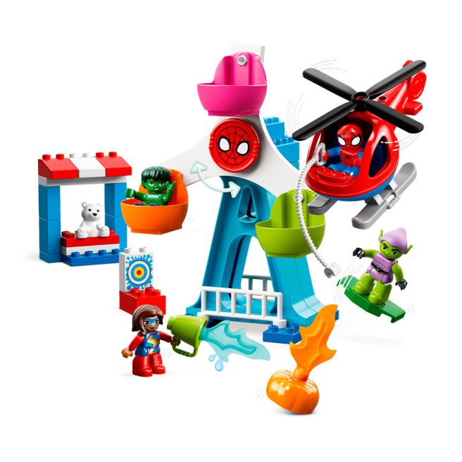 Omul Păianjen, set de joc de dezvoltare pentru copii mici. Acest set de joc versatil combină emoția popularului serial TV Disney+ Spidey și prietenii lui uimitori, cu beneficiile practice de dezvoltare ale construcției LEGO® DUPLO®. Setul constă din trei super-eroi - Omul Păianjen, Miles Morales și Păianjenul fantomă - la sediul lor în formă de păianjen, cu accesorii distractive pentru a inspiră joacă pe roluri imaginativă, inclusiv o motocicletă, un tobogan și un lansator de plasa.