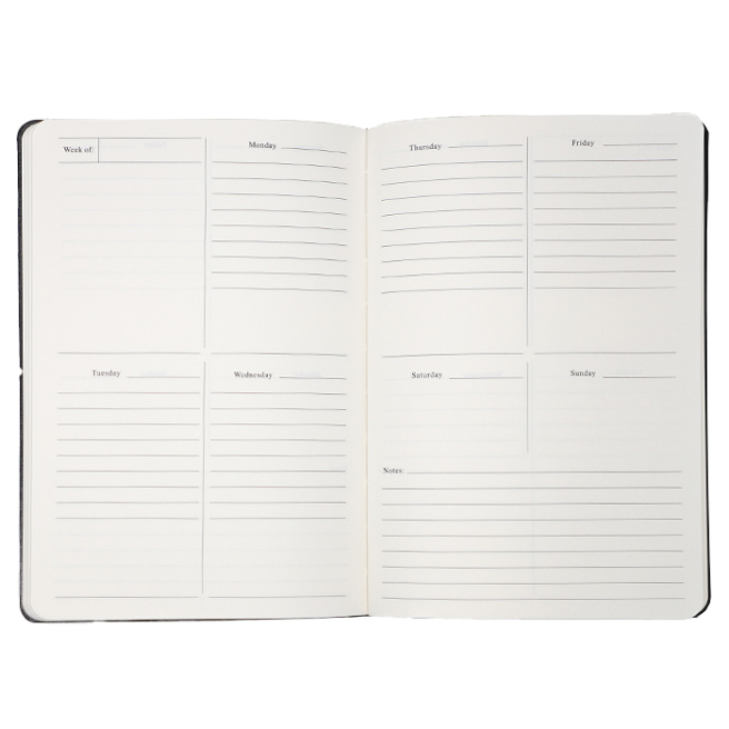 Jumătate din săptămânal este un planificator cu pagini nedatate împărțite în funcție de ziua săptămânii, iar în mijloc sunt câteva foi colorate fără linii care pot fi folosite pentru notițe sau idei.