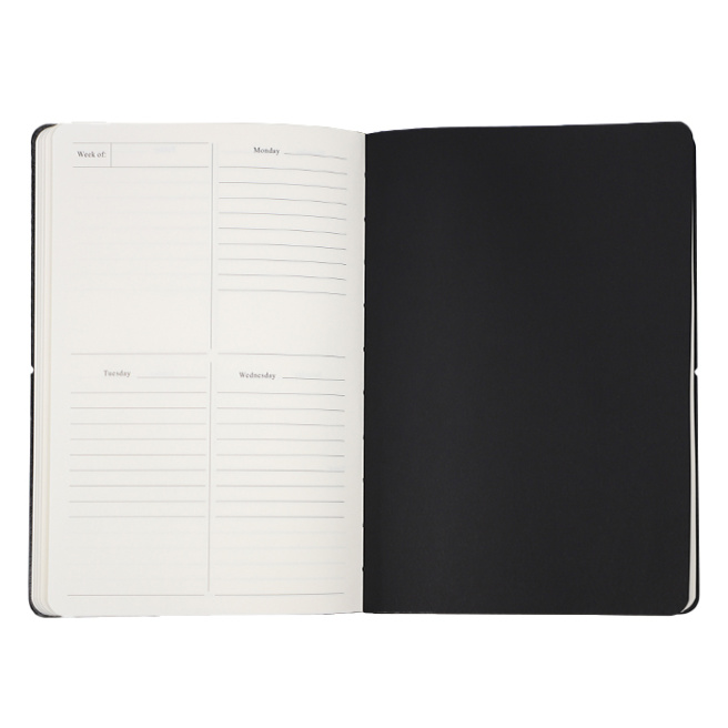Cealaltă jumătate este un caiet cu linii pentru notițe diverse. O copertă flexibilă cu un design elegant și o bandă elastică pentru o închidere sigură oferă confort și protecție. Compact și funcțional, acest caiet săptămânal va fi un companion de încredere pentru muncă, studiu și sarcinile zilnice.