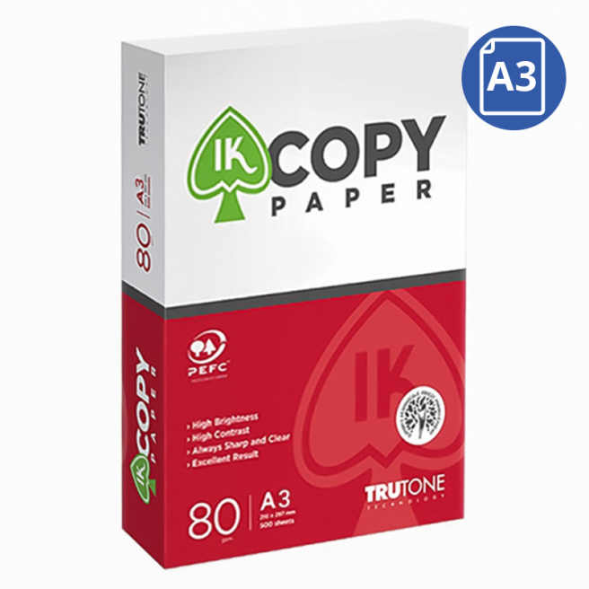 IK Copy Paper o hârtie de calitate, cu un grad ridicat de albeață pentru un contrast excelent. Este potrivită pentru a se utiliza în copiator, imprimantă sau fax. Hârtia este fină, are 80 g/mp și vine ambalată în topuri de 500 de coli. Oferă cele mai bune rezultate la printare. Este fabricată cu tehnologia Trutone ce conferă: negru uniform, culori intense, imagini clare, cerneală ce se usucă rapid. Hârtia are certificare ISO 9001 (Managementul Calității) și ISO 14001 (Managementul Mediului). Farbicată în Indonezia.
