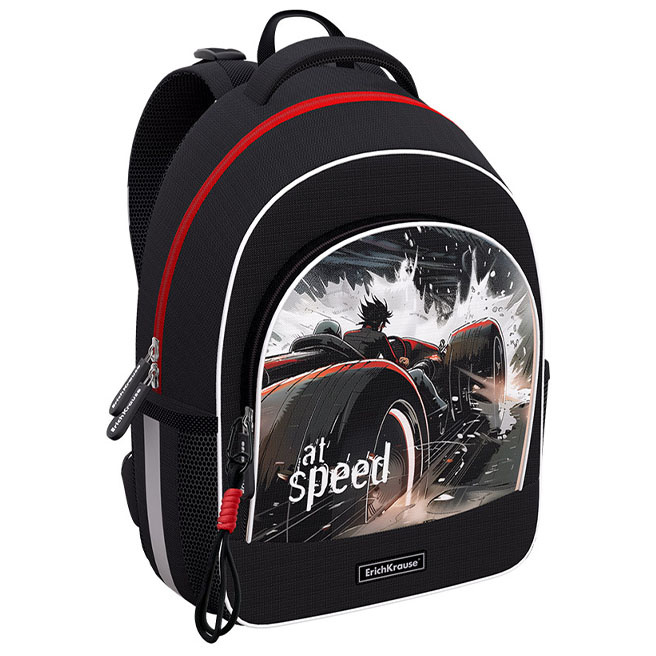 Curelele căptușite în formă de S nu pun presiune pe umerii copilului, iar cureaua de piept fixează poziția rucsacului. Elementele reflectorizante din jurul rucsacului sporesc siguranța în condiții de lumină slabă. Mânerul cauciucat și închiderile curelelor sunt întărite cu cusături suplimentare realizate din fire lavsan. Picioarele din plastic protejează împotriva murdăriei și umidității.