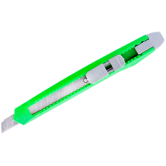 Cuțit de papetărie, cu lungimea de 9 mm, carcasă din plastic, mâner armat cu inserții de cauciuc, fixator de lame mecanic, ambalat în ambalaj blister individual și cu ghid de metal.