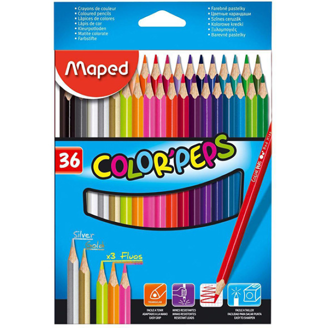 • • Pachet cu 36 creioane de colorat cu formă triunghiuglara pentru o prindere mai ușoară și utilizare confortabilă.