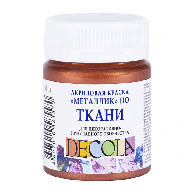 Акриловые краски по ткани «Decola» изготавливаются на основе водной акриловой дисперсии и образуют после высыхания прочную эластичную пленку на поверхности. Краски предназначены для росписи хлопчатобумажных и шелковых тканей. Допускается применение красок на синтетических тканях. При этом рекомендуется убедиться в прочности закрепления рисунка на образце ткани. Предварительно необходимо выстирать ткань без использования кондиционера, высушить и выгладить.