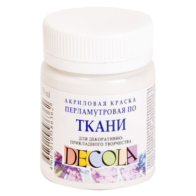 • Акриловые краски по ткани «Decola» изготавливаются на основе водной акриловой дисперсии и образуют после высыхания прочную эластичную пленку на поверхности. Краски предназначены для росписи хлопчатобумажных и шелковых тканей. Допускается применение красок на синтетических тканях. При этом рекомендуется убедиться в прочности закрепления рисунка на образце ткани. Предварительно необходимо выстирать ткань без использования кондиционера, высушить и выгладить.