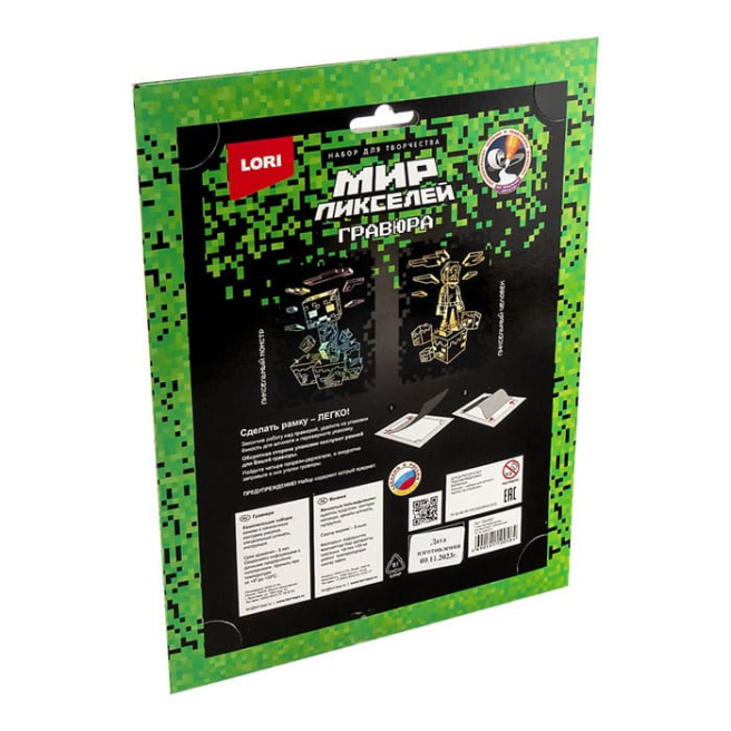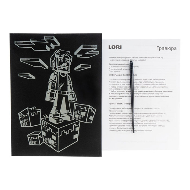 Гравюра представляет собой многослойное панно, покрытое чёрной краской, на которое нанесён контур рисунка. Техника создания гравюры увлекательна и достаточно проста. Необходимо лишь взять штихель – особый скребок, входящий в состав набора, и процарапать рисунок гравюры.