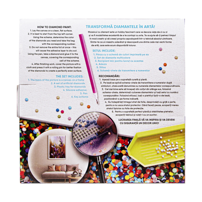 Основные преимущества - полное расслабление во время процесса и пёстрые цвета, сохраняющие свою насыщенность в течение долгого времени. В комплект входит: холст с напечатанной на нём цветной схемой и клейкой основой, набор разноцветных акриловых страз, пинцет, карандаш с силиконовой подушечкой и небольшая тарелочка для удобства работы с камнями.