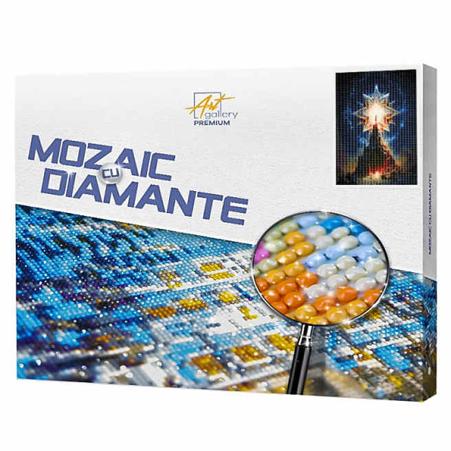 • Алмазная мозаика или алмазная вышивка - способ выкладывания картины на холсте с клейкой основой с помощью небольших акриловых страз. Этот вид творчества не требует много сил и времени для того, чтобы воссоздать ослепительную картину.
