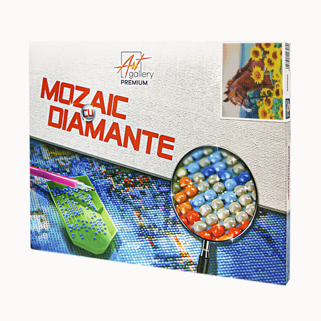 • Алмазная мозаика или алмазная вышивка - способ выкладывания картины на холсте с клейкой основой с помощью небольших акриловых страз. Этот вид творчества не требует много сил и времени для того, чтобы воссоздать ослепительную картину.