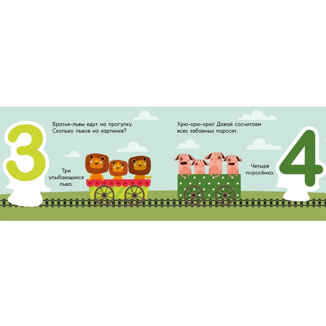 На каждом развороте книги – большие яркие цифры и забавные рисунки животных.