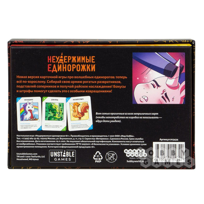 "Неудержимые единорожки" – это весёлая карточная игра, которая украсит собой любую вечеринку. И ещё бы, ведь рецепт этой настолки невероятно прост и изыскан: милые единороги и поразительные разрушения! Игра начинается с малыша-пони, и даже не думайте привязываться к этому очаровательному созданию – вряд ли оно выживет. Этот мир магии и блёсток жесток...