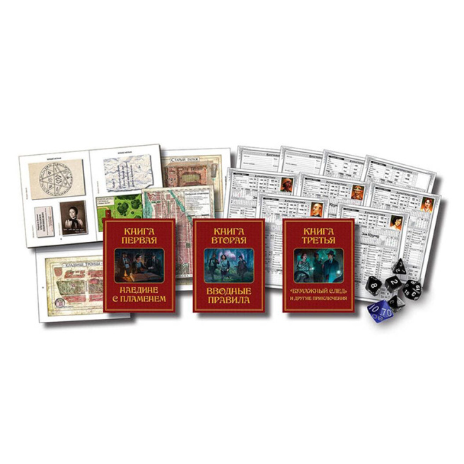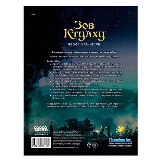 В стартовом наборе вы найдёте четыре приключения, которых хватит более чем на 10 увлекательных часов! В состав набора входят приключения "Наедине с пламенем, "Бумажный след", "Грань тьмы" и "Мертвецкий стомп". "Зов Ктулху" – это классика настольных ролевых игр, получившая более 40 престижных наград и вошедшая в залы славы Academy of Adventure Gaming Art и Design Hall of Fame. А когда освоите правила стартового набора и захотите более глубокого погружения в мир игры – ознакомьтесь с правилами седьмого издания, которые можно найти в "Книге Хранителя" и "Книге игрока".