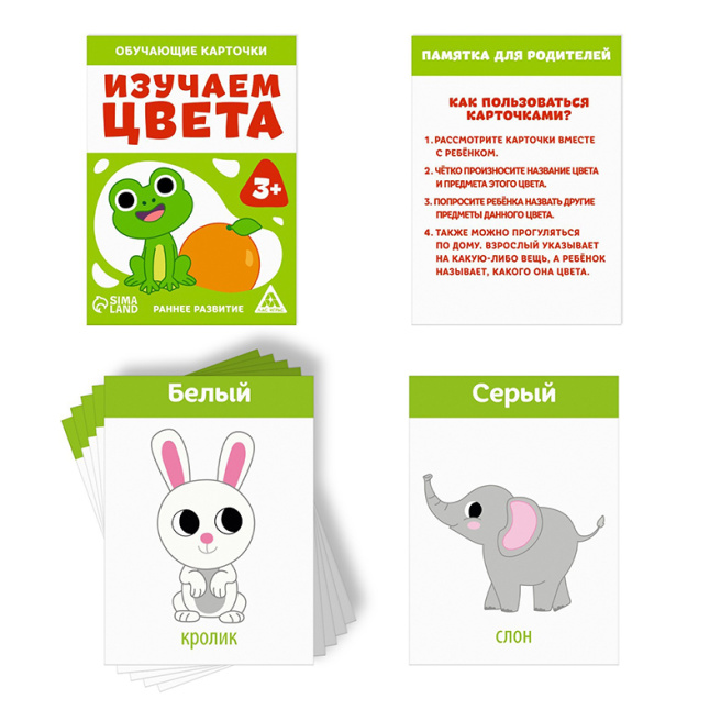 Изучаем цвета в игровой форме Обучающие карточки позволят малышу познакомиться с цветами, а также с предметами этого цвета. С помощью карточек ребёнок разовьёт память, интеллект, зрительное и слуховое восприятие. Подавайте новый материал в игровой форме, так он быстрее и легче усваивается. Как пользоваться карточками? Рассмотрите карточки вместе с ребёнком. Чётко произносите название цвета и предмет этого цвета. Попросите ребёнка назвать другие предметы данного цвета. Вместе прогуляйтесь по дому. Взрослый указывает на какую-либо вещь, а ребёнок называет, какого она цвета. Внутри вы найдёте: 16 карточек, памятку для родителей.