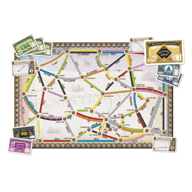 Пенсильванская половина этой коллекции карт добавляет механизм акций к основной игре TtR. Каждый раз, когда игрок завершает маршрут, он претендует на долю одной из компаний, изображенных рядом с этим маршрутом. В конце игры тот, кто владеет большим количеством акций компании, чем все остальные игроки, получает в награду очки.