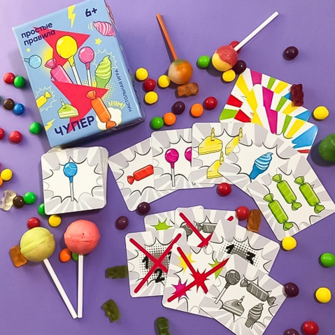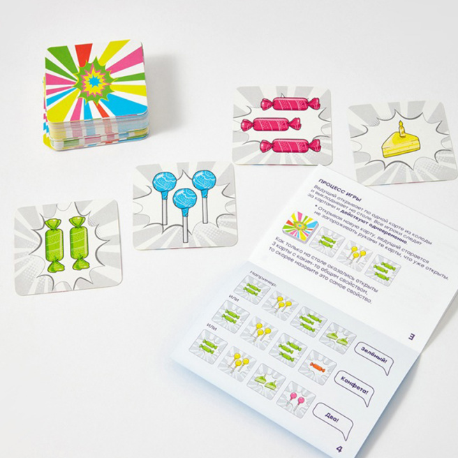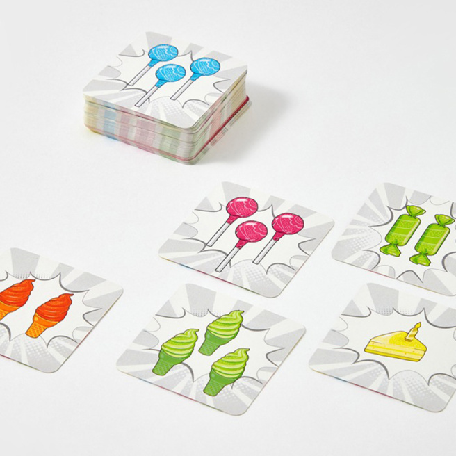 Следи за количеством, цветом и видом сладостей. Называй общее свойство, как только увидишь совпадение на 3 картах - забирай вкусняшки в победную кучу! Победит самый быстрый и внимательный сладкоежка.