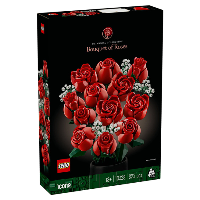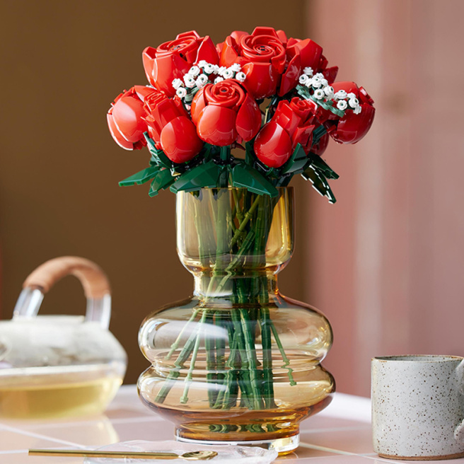 Собирать этот букет LEGO одно удовольствие и изображает дюжину красных роз, в том числе 4 в полном цвету, 4 в цвету и 4 в бутоне, с длинными зелеными стеблями для демонстрации в вазе, а также 4 веточки гипсофилы с маленькими белыми цветками. Букет легко собрать, он станет элегантным украшением любого помещения и его можно комбинировать с другими наборами из ботанической коллекции LEGO.