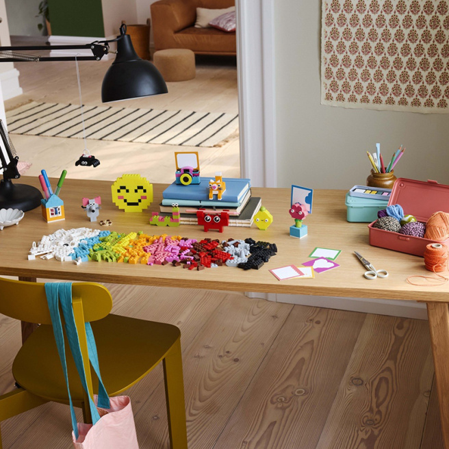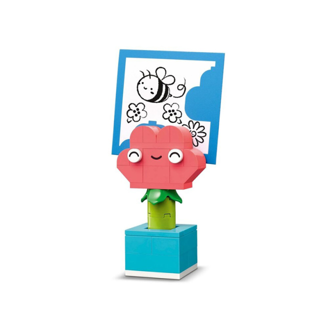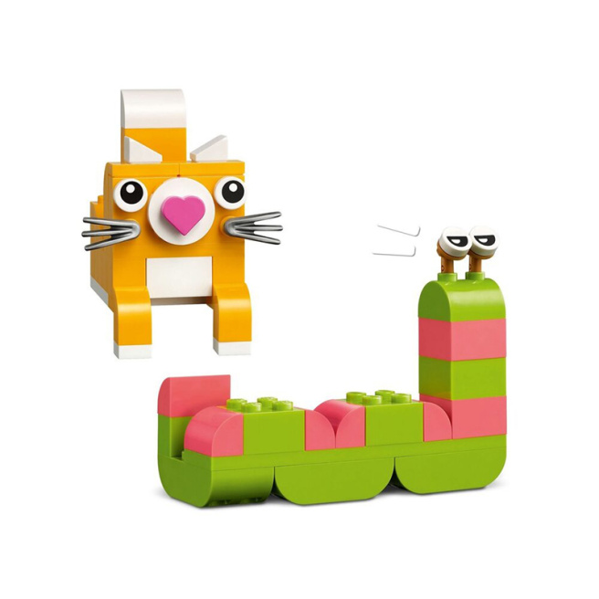 Creative Happy Box содержит предложения по 10 быстровозводимым моделям, каждая из которых призвана вдохновлять на счастье. Дети смогут собрать эти модели в 12 новых игрушек, а затем доработать их до бесконечности - и украсить свою комнату забавными и функциональными предметами, которые они построили сами. Паук, пчела и птица имеют подвесные элементы для демонстрации. Модели краба, обезьянки и домика могут вмещать мелкие предметы, например карандаш или зубную щетку. В модели цветка, фотоаппарата, зажигалки, сердца и кактуса есть элемент-зажим, на который можно прикрепить записку, открытку или картинку (цветная бумага входит в набор). Среди других моделей - кошка, мышка, лимон, червяк и смайлик.