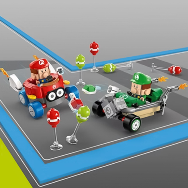 Участвуйте в автогонках и гонках на воздушных шарах с этим игровым набором для детей «Малыш Марио против Малыша Луиджи». Интересный подарок на день рождения Mario Kart для мальчиков, девочек и геймеров от 8 лет. В набор входят две коллекционные фигурки Nintendo — Малыш Марио и Малыш Луиджи, а также их игрушечные машинки Биддибагги и Три-Спидер. Каждая сборная машина может запускать снаряды, и есть 6 сборных воздушных шаров (3 красных, 3 зеленых), в которые можно целиться. Кто первым опрокинет свои воздушные шары?