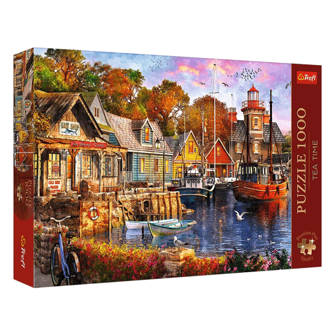 На пазлах Приморский уголок изображена пристань в приморском городке. После их составления будет создано изображение размером 683x480 мм.