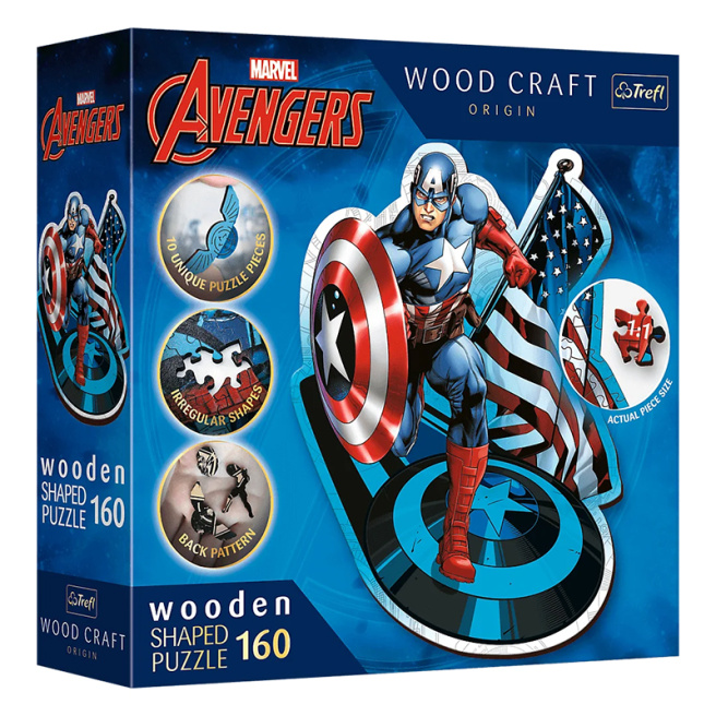 Деревянный пазл Fearless Captain America - уникальное предложение для поклонников Мстителей. Эти атмосферные пазлы состоят из 160 деталей, среди которых 10 уникальных фигурок, связанных с миром Marvel. Пазл изготовлен из дерева, а упаковка - из экологически чистого картона.