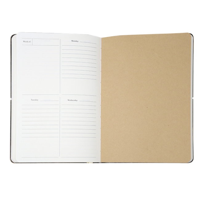 Половина еженедельника представляет собой планировщик с недатированными страницами, расписанными по дням недели, а в середине находятся несколько цветных листов без линовки, которые можно использовать для заметок или идей.